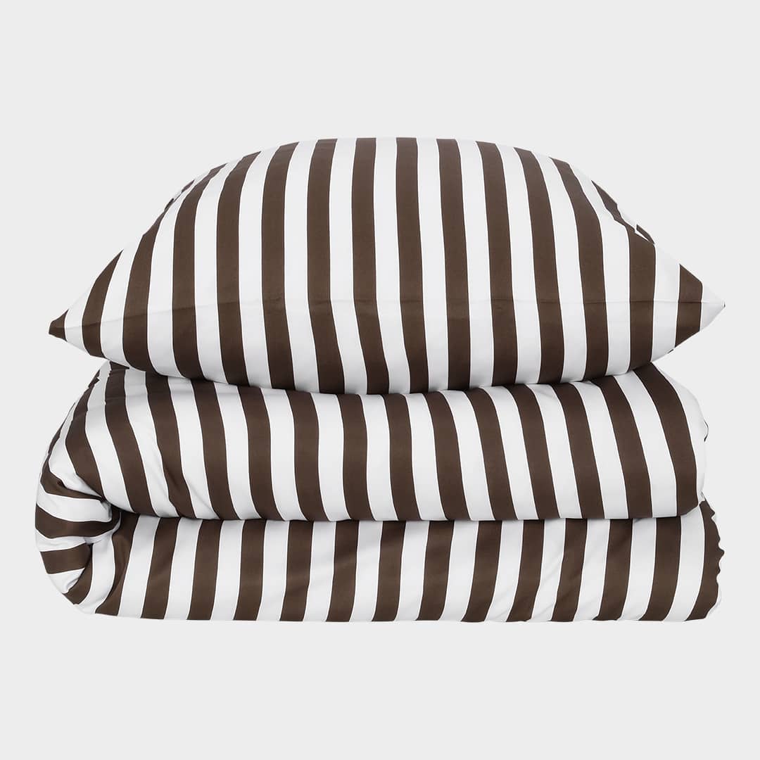 Bredstribet hvidt og brunt sengetøj i silkeblødt og åndbart bambus Vores bambus sengetøj 140×200 i hvide og brune brede striber, er det helt ideelle sengesæt til dig som leder efter en tidløs tilføjelse til dit soveværelse, men som også går op i at få det