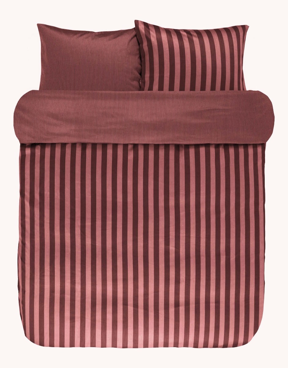 Bomuldssatin er et af de blødeste og mest fantastiske produkter, som du kan ligge dig til at sove i. Det falder let omkring huden og lægger sig behageligt om din krop. Her ser du et helt klassisk rødligt stribet sengesæt, som passer til alle lejligheder o
